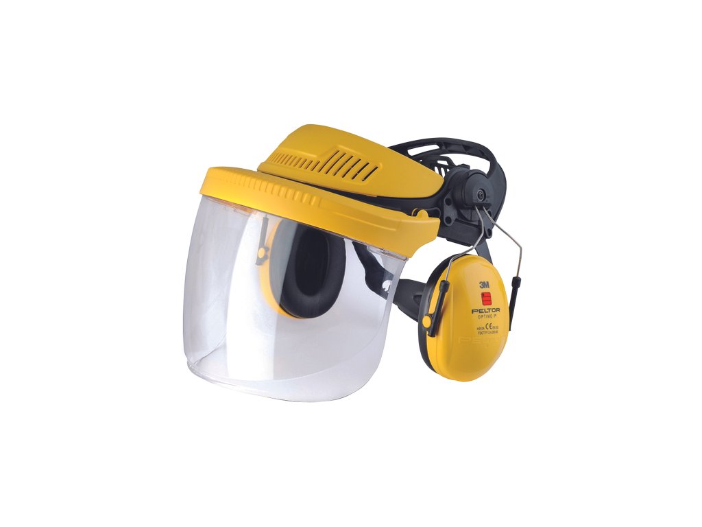 kombinace náhlavního systému 3M G500 s čirým polykarbonátovým obličejovým štítem a sluchátky OPTIME I; vážená hodnota útlumu SNR 26 dB.