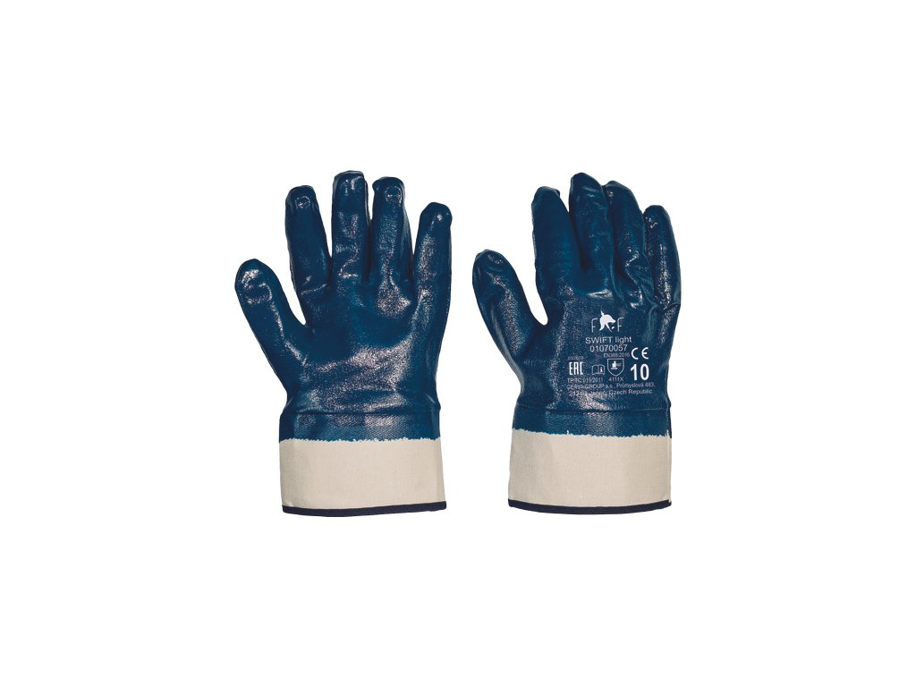 • šité rukavice z bavlny • máčení v nitrilu • pevná manžeta