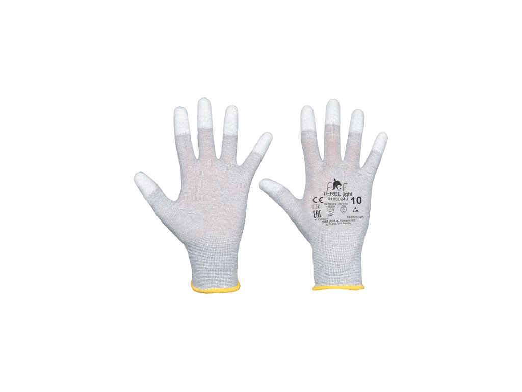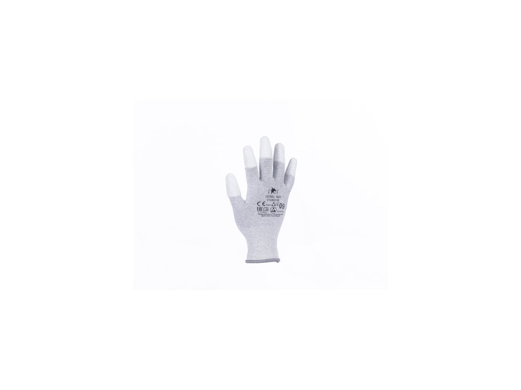 • bezešvé antistatické polyesterové rukavice s integrovaným uhlíkovým vláknem • máčené v polyuretanu na špičkách prstů • pružná manžeta