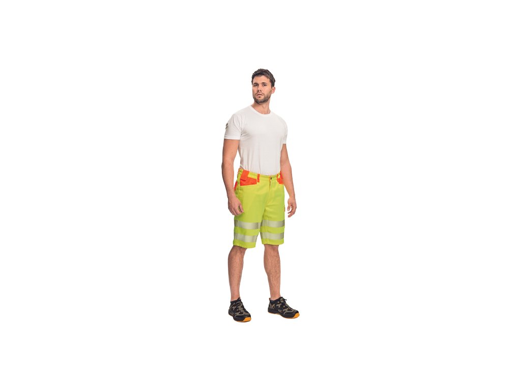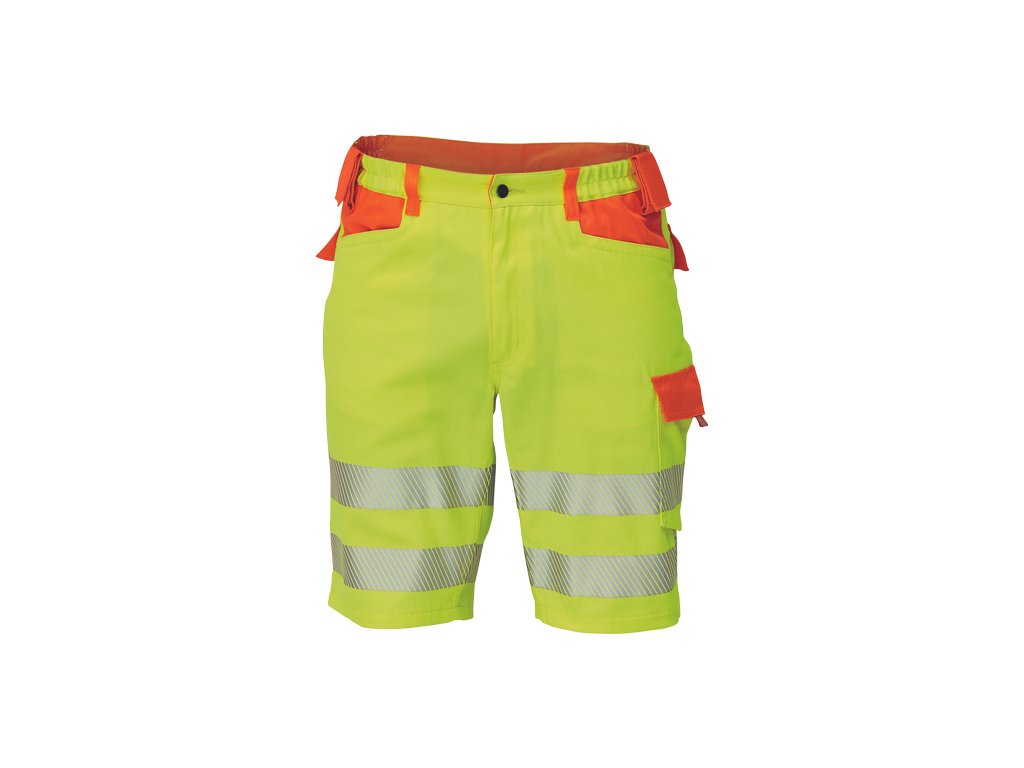 • kvalitní pánské šortky v kombinaci dvou HI-VIS barev • segmentované reflexní tištěné pruhy okolo stehen, 2 hluboké přední kaspy, 1 multifukční kapsy na straně nohavice, 2 zadní kapsy s patkou • elastický pas
