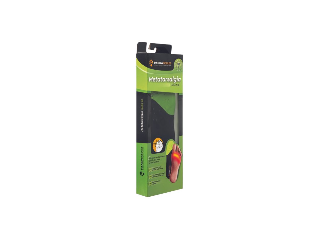 stélka Metatarsalgia se doporučuje pro uživatele, kteří jsou zvláště vystaveni namáhání přední části chodidla, aby se zlepšilo zdraví nohy uvnitř obuvi a aby se zabránilo nebo zmírnilo od bolesti; inovativní design kombinuje působení nárazu tlumící vložky umístěné ve výšce metatarzů, s působením dalších dvou vložek Memory Foam, což podporuje zdraví chodidel, kolen a zad; vložky Metatarsalgia jsou ideální oporou pro prevenci opruzeniny a bolesti způsobené třením v přední části chodidla; vložky také poskytují podporu pro příčnou klenbu nohy, čímž snižují tlak a váhu kladenou na metatarz; jednotlivé velikosti vnitřní stélky lze upravit zkrácením její špičky dle značení na její spodní straně