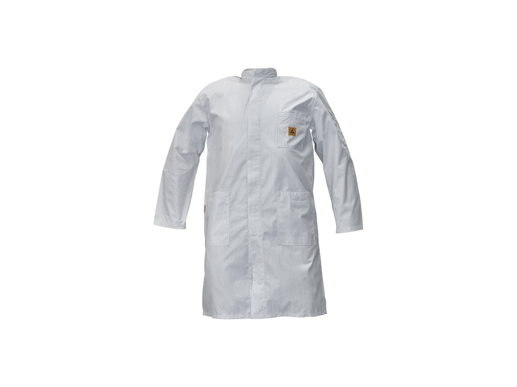 • ESD plášť se stojáčkem, krytý légou • zajišťuje ochranu elektronických součástek před elektrostatickými jevy • 2 přední kapsy • 1 náprsní kapsa