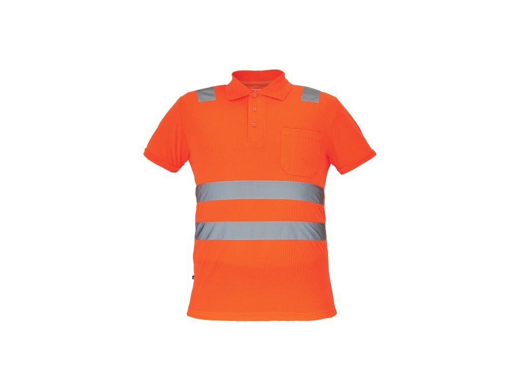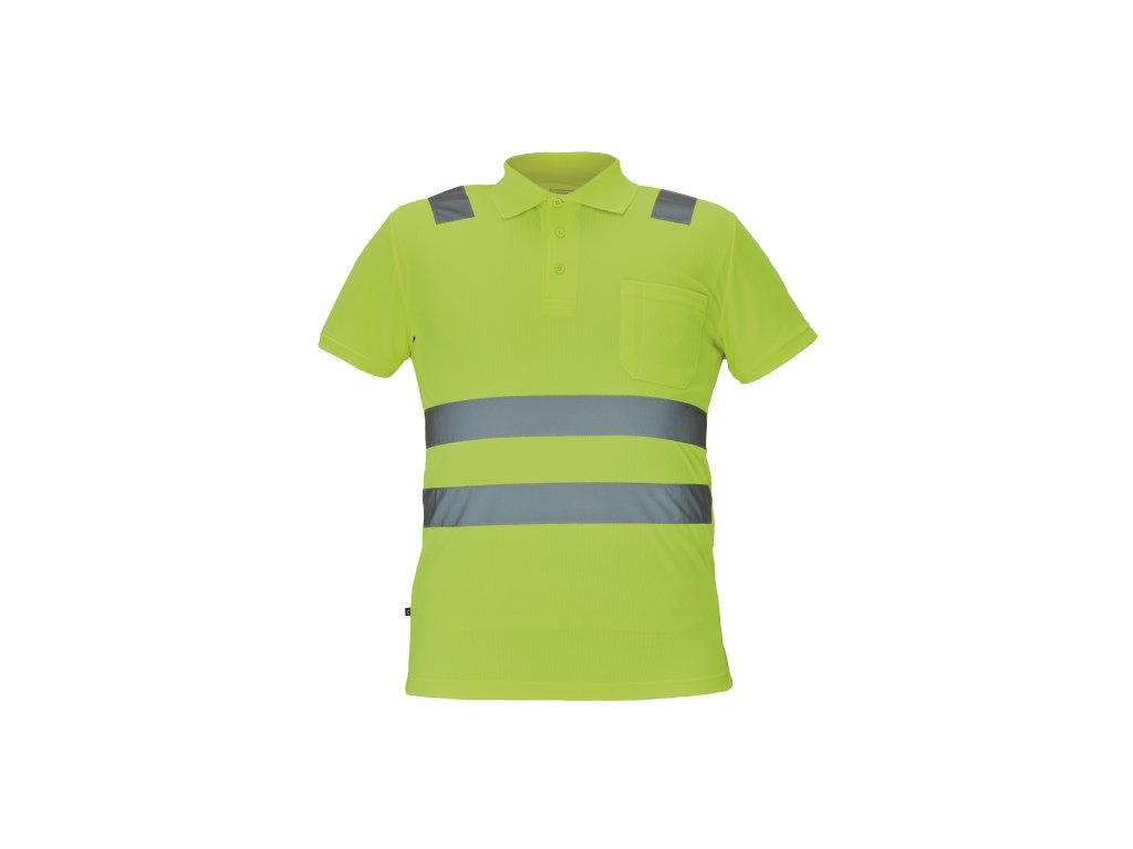 • pánská full HI-VIS polokošile s reflexními pruhy přes ramena a v bocích • zapínání na 3 knoflíky • 1 náprsní kapsička • žebrovaný límeček a lemy rukávů